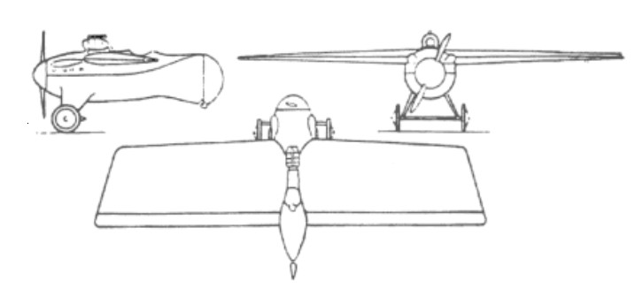 The first design of the Simplex firm was a racing monoplane with a 320 hp Hispano-Suiza engine for the Coupe-Deutsch race of 1922. The design was due to Carmier, and the plane was to be flown by a well-known fighter pilot, Georges Madon. It was a cantilever monoplane with a tractor engine and full-span controllers. The short fuselage ended in a vertical fin with a rudder. The pilot sat rather far back behind the leading edge of the wing ; in addition, a barrel radiator excluded any view forward. So it was not surprising that even a very experienced pilot like Madon could meet with an accident during a test flight prior to the race. He escaped with severe injuries, and the general impression created was rather unfortunate. Since Fétu had previously met with a grave accident with the Arnoux biplane, the fate of this interesting development was sealed. Arnoux himself seems to have been discouraged from further pursuing his line of investigation.