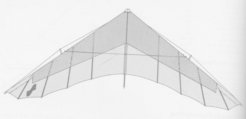 The Merlin is a double-surfaced flexible wing designed for cross-country and competition flying. Strong construction and pitch-positive airfoil plus higher tha normal wing loading help cope with turbulence. It has been test flown through completely vertical dives and sideslips and past vertical wing-overs, pulling up to 4.5G recorded.