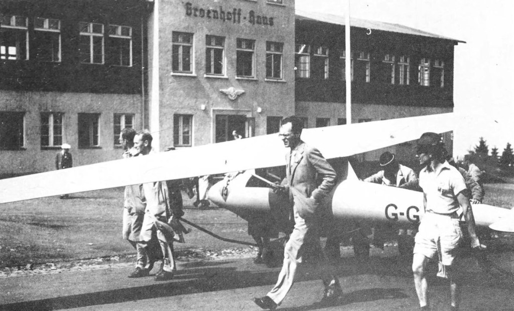 The first truly international soaring championships were held in Germany during July 1937. Five British sailplanes were entered. Wills preferred to take Hjordis, with which by now he was thoroughly familiar, rather than one of the new and, as it proved, unreliable King Kites. Wills placed 14th, exactly halfway down the list. He had his usual problems on landing, ending one flight with the sailplane’s nose in a stream but he and the rest of the British group learned a great deal by observing how the more experienced German and Polish pilots flew. Doubts about the thermal soaring capabilities of their large aircraft were entirely dispersed.