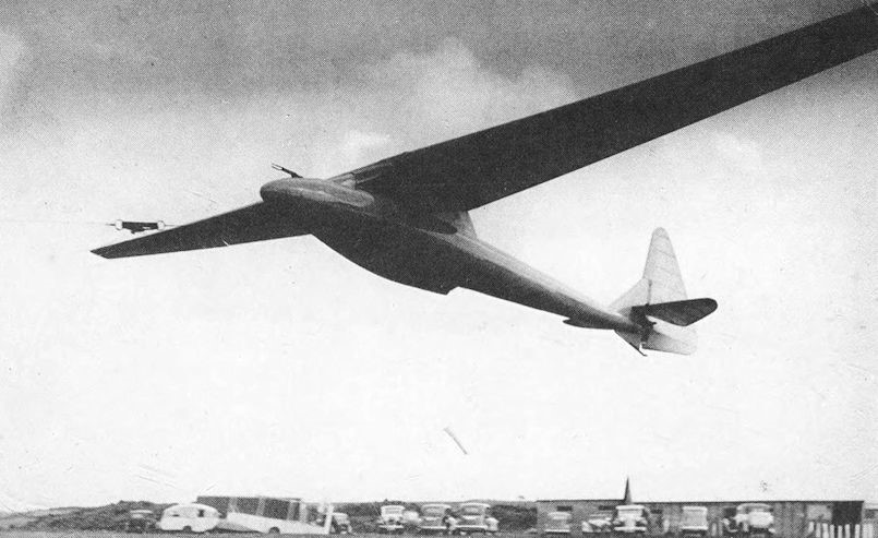 Probably most serious of all, the Hjordis had no spoilers or airbrakes. Philip Wills was beginning at this time, as he put it, to nibble nervously at clouds, and he had fitted some gyro instruments. On his first serious attempt to circle up blind inside a cumulus, at an Easter meeting in Derbyshire, he lost control within a minute or two. The airspeed indicator went twice round the dial and he ‘burst out of the cloud base in a dive rather over the vertical’ with the Hjordis ‘bellowing like a bull in considerable pain’. The sailplane did not break up, probably owing to the good torsional resistance of the plywood skinned wings.