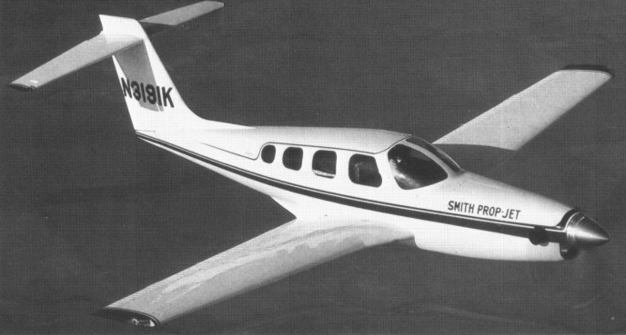 The 1982 Prop-Jet N3191K uses Beechcraft P-Baron wings and landing gear mated to a Smith T-tailed carbon fibre composite fuselage.