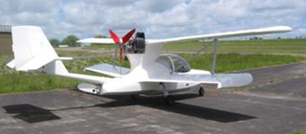 A side by side two seat amphibious pusher biplane. A full detachable canopy that can be converted into an open cockpit with its own separate windshield.
