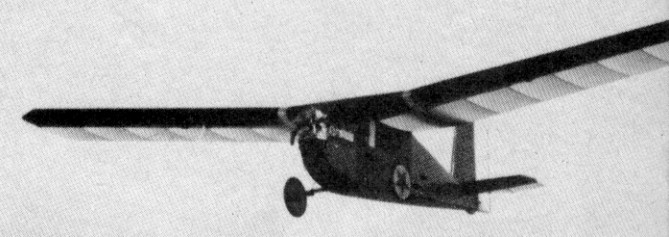 Single seat single engine high wing monoplane with two axis control. Conventional tail. Pitch control by elevator on tail; yaw control by fin mounted rudder; no separate roll control; control inputs through stick for pitch and pedals for yaw. Cantilever wing; wing profile; double surface. Undercarriage has two wheels with tailskid. Wood/foam fuselage, partially enclosed. Engine mounted at wing height driving tractor propeller.
