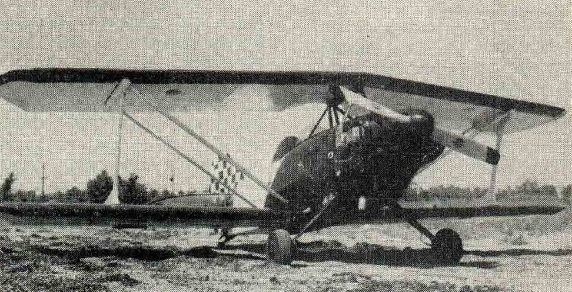 The top wings are swept back, and lower wings are straight. Both sets span 17 ft. Note that the centre pylon slopes inward from the fuselage top. Arrangement of the other struts is a pair of parallel struts and I-struts connecting the wings at the outer brace point. Ailerons are only provided on the lower wings.