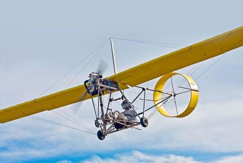 Mark Stull built Lucky Stars with a 4.5-foot-diameter ring tail. It took some clever engineering and some hair-raising test flights to make it work. Stull added a hydraulic damper to ensure that the tail didn’t swing too far to the side, and balanced the tail by adding weights to the ring. He then moved the seat forward to maintain the craft’s centre of gravity.