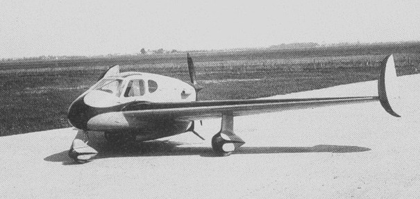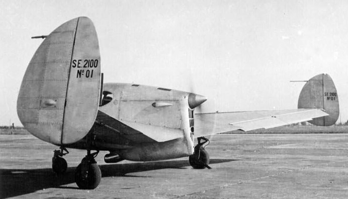 The Sud-Est or SNCASE SE-2100, sometimes known as the Satre SE-2100 after its designer, Pierre Satre, later the chief designer of the Concorde, at the end of World War II. An all-metal tailless, pusher configuration aircraft, it had a low, cantilever, straight tapered wing with 55° of sweep on the leading edge and 10.43° of dihedral. There were fixed leading edge slots and trailing edge ailerons but no conventional flaps. The wing tips carried large, rounded fins with rudder-like rear portions which only moved outwards; they were used differentially for yaw control and jointly as flaps.