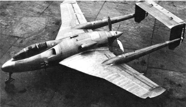 The subject of an order for two prototypes on 31 May 1946, the SO 8000 Narval (Narwhal) was conceived by a team under the leadership of Ing Dupuy at the Societe Nationale de Constructions Aeronautiques de Sud-Ouest (SNCASO) as a shipboard fighter and attack aircraft. Of twin-boom configuration with a sweptback wing – 24 degrees inboard and 13.5 degrees outboard on the leading edge – and a tricycle undercarriage, the Narval was powered by an Arsenal 12 H-02 (Junkers Jumo 213) engine rated at 2,250hp, installed as a pusher and driving contra-rotating propellers. Proposed armament comprised six 20mm cannon with provision for up to 1000kg of external ordnance.