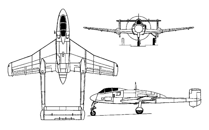 Development was somewhat protracted, and the first flight (by the second prototype) did not take place until 1 April 1949, the second following on 30 December. Numerous problems arose during the test programme, dictating changes in the control surfaces, the air intakes and the propellers (Rotol propellers replacing the original Chauviere units); constant troubles were experienced with the engine, and, following the generally unfavourable results of evaluation at the Centre d’Essais en Vol in January 1950, development of the Narval was discontinued. The second prototype effected its 43rd and last flight on 8 January 1950, and the first prototype flew only once. Proposals to adapt the design for a Rolls-Royce Nene turbojet as the SO 8010 were not pursued. The quoted performance was not, in fact, achieved during flight test.