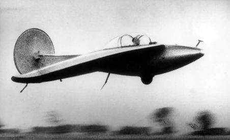 One of the main features of the machine discovered during tests was the aerodynamic effect of the ‘air cushion’. Owing to the proximity of the wing to the ground, and thanks to its circular form, the influence of the cushion on the landing and take-off characteristics proved most beneficial. At a height of 1.5-2m / 59-79 in Discoplan-II automatically stabilised both in the lateral and transverse directions and could fly without the pilot touching the controls. In gliding down to land the pilot also felt how the Discoplan was “padded” by the air cushion. Thus, the landing was also of an automatic.