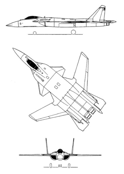 A forward swept wing research aircraft. The S-37 uses some Su-27 parts, including the undercarriage and vertical tails. Sukhoi uses up to 90 percent composite materials in the wing’s structure, and these have proven able to cope with the considerable bending and structural loading on this type of wing during close-in maneuvering across a wide speed range.