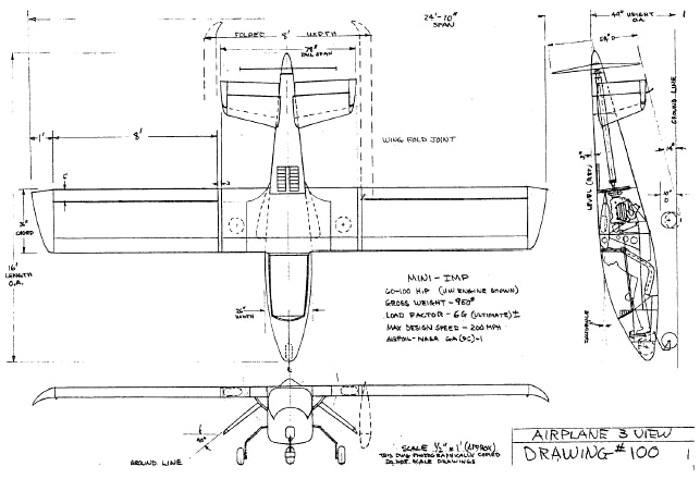 A prototype of the Model “C” has been flown extensively and its improved performance with the higher power is evident. Flight tests of the O-200 powered Mini-IMP “C” have shown a cruise speed of approximately 175 MPH at 4000 foot altitude at 75% rated power. Climb speeds of better than 1500 FPM are initially available at full throttle. These performances are obtained at approximately 1000 pounds gross weight. Exact performance to be obtained with any engine combination is of course dependent on the power level the builder wants to pull from his engine/propeller installation. The O-200 Model “C” requires approximately the same takeoff and landing run as the VW versions, with exact performance dependent on temperature, altitude, and gross weight.