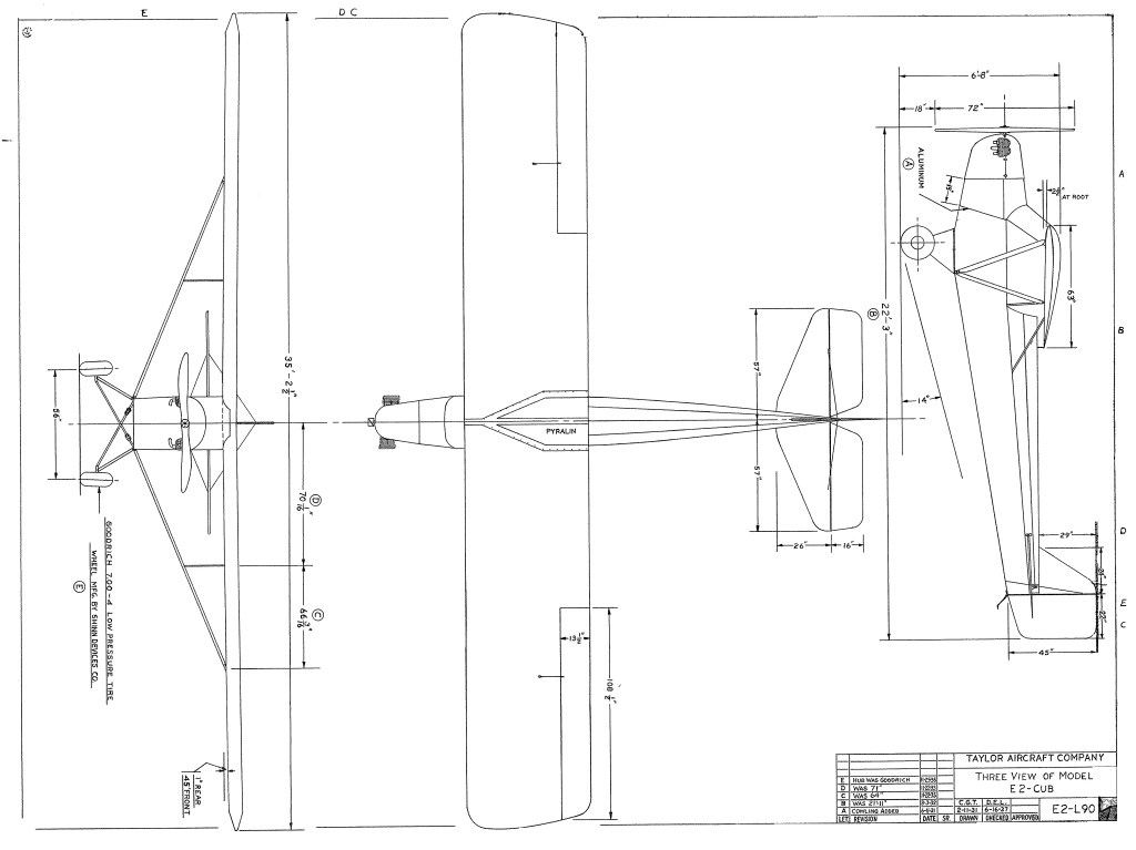 Reliable lightplane engines were virtually nonexistent when the E 2 was designed. For the first E 2, Taylor found a two cylinder engine of 20 horsepower. It was known as the Brownbach Tiger Kitten, and the name reportedly inspired the E 2 to be called the Cub. The plane handled fine on its first flight (in September 1930) but on 20 hp didn’t get too high five feet, actually The new Taylor E-2, now known as the “Cub,” was meant to be an affordable aircraft that would encourage interest in aviation and was awarded its type certificate on July 11, 1931 and licensed by the U.S. Department of Commerce for manufacture.