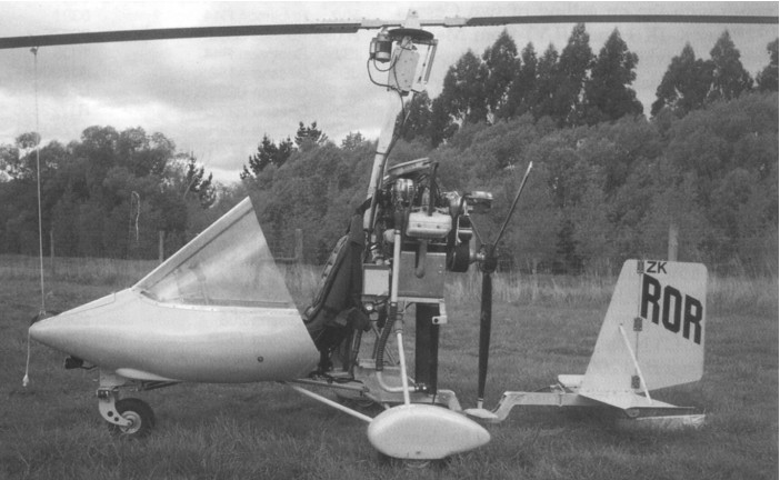 The autogyro, ZK-ROR, was not built from plans as such, but from sketches and photographs. Initially, the vertical line of thrust was wrong and he rebuilt the gyro using information gleaned from a trip to Australia. The rotor head is controlled by Morse cables, rather than the usual tube rods, and the aircraft is powered by a Subaru EA81 driving a Brolga 68‑inch prop via Rex’s own “redrive” unit, which has been inverted to cure the initial trust line problem (along with lengthening the tail boom by some 30 cm).