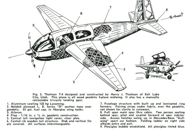 In 1949, Harry formed Thalman Aircraft Inc. at Salt Lake City. In the same year, he designed the Talman T-4 which, flew in 1951. The 1953 Thalman T-4 was a four-pace mid-wing cabin monoplane of all-wood geodetic construction. The T-4 followed the same wooden geodetic construction employed by Harry J. Thalman and William Earl Player when they helped form Plxweve Aircraft. (Construction techniques followed those of Thalman’s Oregonian mentor, George Yates – bending strips of cedar around heated former moulds.) In general construction technique, the T-3 and T-4 were similar – the T-3 being fabric-covered, the T-4 having a fibreglass covering.