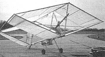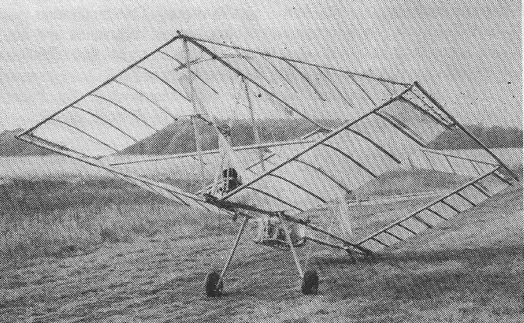 Thompson expanded his experiment in powering a boxkite with a model airplane engine into full-size reality with twin vinyl-covered aluminum-tube frames and a 55hp snowmobile motor and a prop in 1972. A two-place tandem “flying box-kite” a test pilot, reported in his own words, “Great stability. I was 35 feet off the ground before I realized I had taken off!”