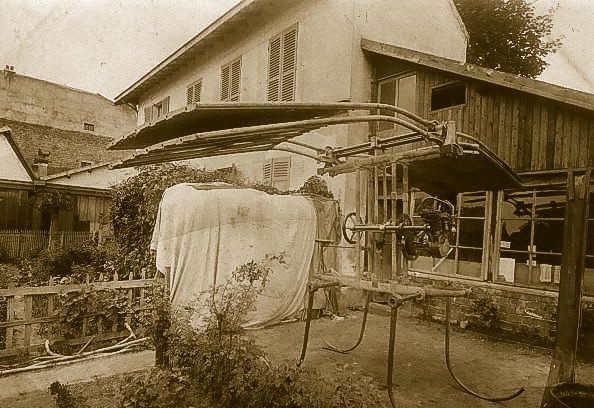 The 1908 Orthoptère of Spiridon Tsapenko [Спиридон Цапенко] and Joseph Michel Ambroise Farcot. The two photos taken by Branger on July 21, 1908 show a small scale version built as a pre-study for a full-size higher powered machine. This trial version had a 12 hp Farcot engine of 20 kg in weight, bringing the total weight of the machine to 150 kg.