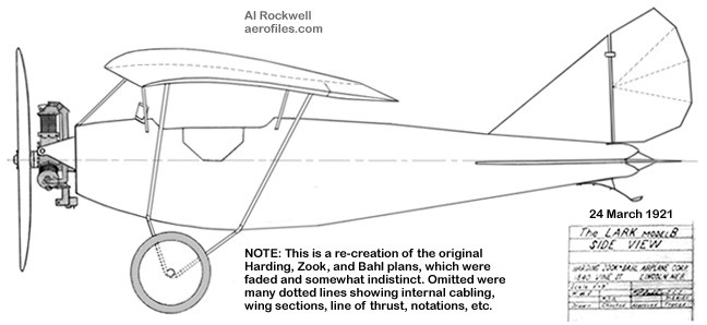 This Lark was built in 1921 by the Harding, Zook, & Bahl Airplane Co of Lincoln, Nebraska. The original design having been worked out by E.G. Bahl. It featured a layered wood-strip monocoque fuselage with only four bulkheads.