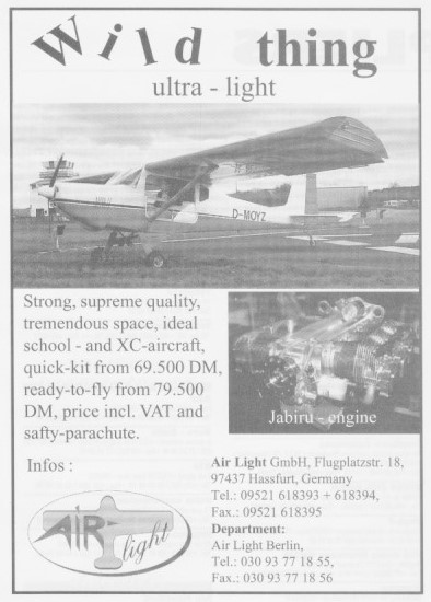 Since 1997 the Wild Things have been built in WT 01 and WT 02 versions at the Aerodrome Hafurt (EDQT). Construction is of aluminum and the Wild Thing is suitable for training, towing, as well as for the relaxing.