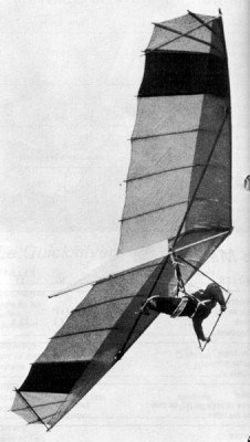 A 1980 hang glider with a 140 ° angle, shaped slats, double sail at 30%, a floating transverse and a sliding umbrella, the speed range is not very large. The finish is good, the assembly is fast although the umbrella sometimes tends to get stuck on the keel. For safety, Véliplane provided 4 booster cords.