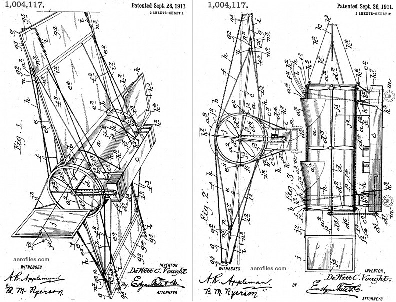 In 1911 the US patent #1,004,117 was issued 9/26/11 for an “aeroplane with car containing motor, etc, free to swing” to De Witt C Vought.