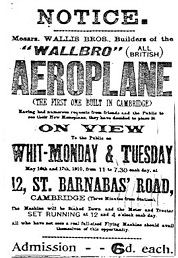 All-British aeroplane constructed by brothers Percy Valentine & Horace Samuel Wallis in the shed at the rear of their parents’ house in Cambridge with ‘offices’ of the Wallbro Aeroplane Co. in their bedroom overlooking the rear garden. By May 1910, it was complete and was put on display to the public. On July 4, 1910, the brothers made their first tentative ‘hop’ near Abington, where the machine had been brought to be housed. A complete and detailed description of the craft can be found in the Thursday, May 12, 1910 edition of the Cambridge Daily News.