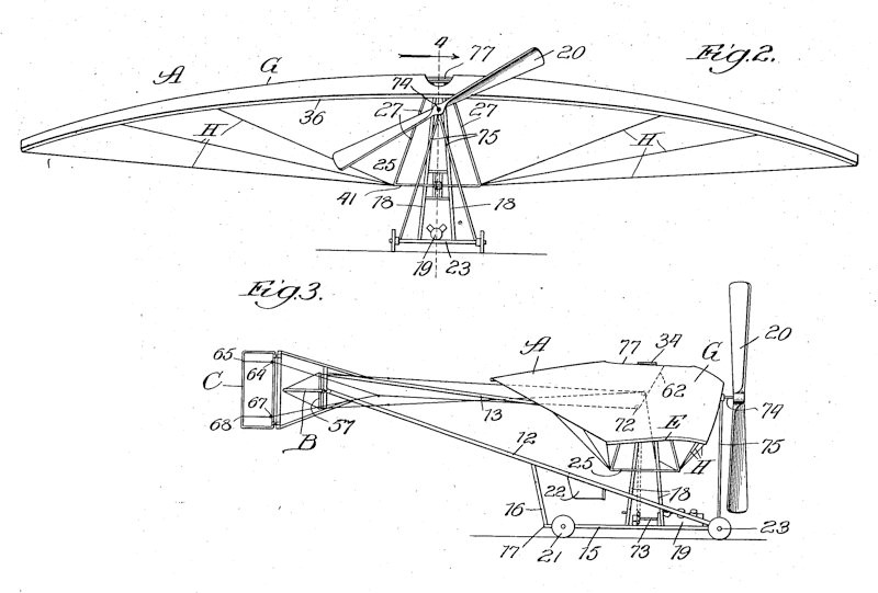 A shoulder-wing monoplane which John A. Warrick of Chicago applied a patent for in 1910 (granted in 1912), the intention being that it would “automatically maintain a proper equilibrium under all ordinary or normal conditions in flight”. This was achieved by a control system that, among other things, allowed the pilot to change the incidence of the somewhat parachute-like negative-dihedral wing. It’s not known if it was built.