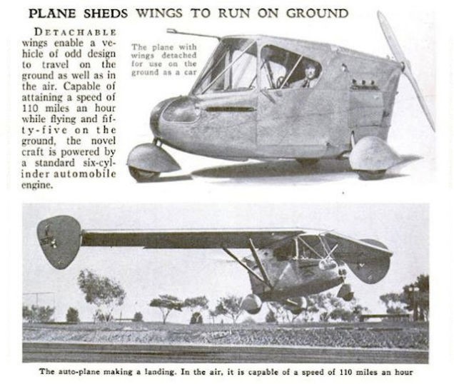 The Arrowbile’s wings housed all the machine’s control mechanisms and could be detached or hooked up for flight in just three minutes. During tests it cruised at speeds in excess of 160 kph (100 mph) in the air and 72.5 kph (45 mph) on the ground. The Studebaker Corporation with an offer to sell Arrowbiles through their dealer network at $3,000 apiece. Waterman set up a factory in Santa Monica and started building five examples for Studebaker’s salesmen to demonstrate throughout the United States. After the success of the Arrowplane (W-4), the engineer built the W-5, which had easily detachable wings, and a propeller. It could fly at 112 mph (180 kph) and drive at 56 mph (90 kph), thanks to its 100 hp Studebaker engine.