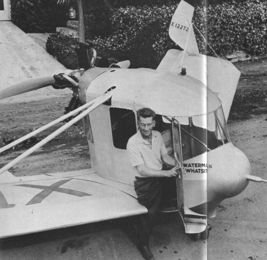 Waterman spent several days taxiing around the field, feeling out the plane’s characteristics, then finally tried a faster taxi down the runway, gradually advancing the throttle. On the threshold of take-off, the front wheel dropped into a gopher hole, the doors flew off their hinges, and the “Whatsit” flew at minimal altitude for about 30 feet before coming to a brutal halt. The first actual “flying wing” monoplane was rebuilt to enter a 1933 safety plane competition, winning one of the only two awards out of 30 entries.