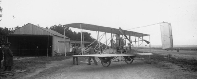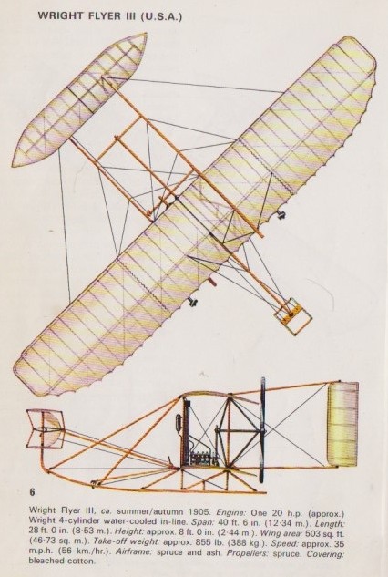 Although, in many respects, the Flyer III had a general resemblance to the first two machines, it was much more efficient. It was completed by the Spring of 1905: it was a biplane with a wing-span of 40ft 6in, the 15-20 horse-power motor driving two pusher propellers. The pilot, as in the two previous machines, lay prone to reduce head resistance. This new Flyer, like its predecessor of 1904, was taken to the Huffman Prairie, a 90-acre pasture at Simms Station, about eight miles northeast of Dayton, which was the world’s first aerodrome, and had been lent to the Wrights in 1904 by their friend Torrence Huffman, a Day-ton banker. The machine was flown by Wilbur and Orville from June 23 to October 16, and made over 40 flights. The longest flight of this famous “season” was on October 5, when the Flyer III (piloted by Wilbur) was airborne for no less than 38 minutes 3 seconds; it travelled over 24 miles, at an average speed of about 38 miles per hour, making more than 29 circuits of the pasture. The Flyer made many other excellent flights, under perfect control, including another one of over half-an-hour, one of 25 minutes, and three of over a quarter of an hour. No aero-planes, other than those made by the Wrights, could equal the performance of this Flyer until October, 1908, by which time the Wrights themselves were making flights of over 1½ hours’ duration. The one remaining problem was solved on this machine; how, by putting the nose down on tight turns, and gaining speed, a stall could be avoided. The Wrights knew that with this Flyer III they had a winner.