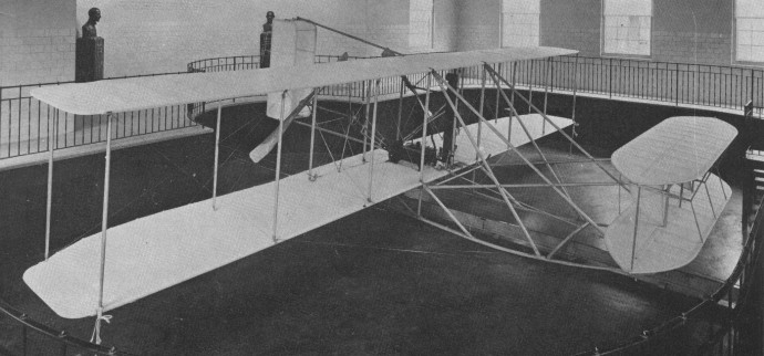It was Colonel E. A. Deeds, Chairman of the National Cash Register Company, who in 1946 had proposed that a permanent exhibition of early American methods of transportation be housed in Carillon Park. He then felt that the Wright brothers, who had become Dayton’s most famous citizens, and who had done so much of their work in Dayton, must be worthily represented in the exhibit; so he approached Orville Wright himself about this proposal. Orville at first suggested showing a replica of the famous “Kitty Hawk” machine of 1903 (the Wright Flyer I); but then he had another idea, and a much better one. He told Colonel Deeds that he thought it would be possible to assemble most of the original Wright Flyer III of 1905, Flyer II having been broken up, which he and his brother had flown so successfully at the Huffman Prairie; whereas a replica of the Flyer I would possess far less local interest, as it had only been flown at the Kill Devil Hills, and never at Dayton. This suggestion by Orville Wright was enthusiastically accepted by Colonel Deeds, and the delicate work of restoration was put in hand. The finished machine, in the elegant building specially constructed to house it, was displayed to the public for the first time in June 1950.