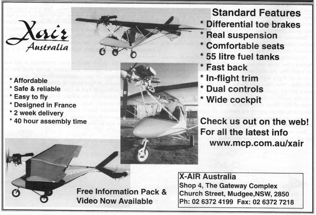 The standard and flap model X-AIR were available with three engines from Rotax-Bombardier of Austria, the Australian produced Jabiru engine and the HKS from Japan. Rotax options being the 52 HP “503” or the 65 HP “582” and the 80HP “912” with carbon fiber Brolga ground adjustable props.