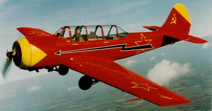 The Yakolev Yak-52 is a two-seater tandem low wing civil and military aerobatic trainer aircraft with semi-retractable tricycled landinggear. Development of the Yakolev Yak-52, originally known Yak-50U, started in 1973 as a successor of the Yakolev Yak-18 training aircraft. The Yakolev 52 was designed by the Yakolev Design Bureau as a trainer version of the single-seat Yak-50. The prototype was flown first in 1974. Production was initiated in 1976 at the Intreprinderea de Avioane Bacau factory in Bacau, Romania and production of the Yak-52 started in 1977.