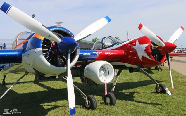 A team from Arizona led by mechanic and restorer Dall Koller and aerobatic flight champion Jeff Buerbon built two Yak-55M as Siamese twins.