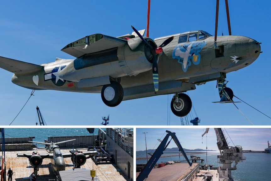 On Thursday, the Douglas A-20 Havoc bomber was loaded by crane onto the Navy’s ADV Reliant ship at Townsville, after being transported by truck from the Royal Australian Air Force base at Amberley near Ipswich, Queensland.