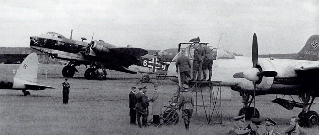 Rechlin Test Centre 3 September 1943. From left – DH Mosquito, Short Sterling 6+8 captured in Holland September 1942. B-17F 41-24585 ex-303rd Bomb Group, and early He 219 night fighter prototype