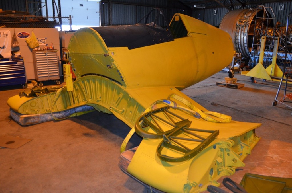 She was lifted off the pole in July 2008 and brought to the CASC’s restoration shop. It was in sad shape. Many important parts had been thrown out before she had been installed on the pedestal in an attempt to make her lighter. Control surfaces, wing flaps, dive brakes, and landing gear were missing. Simple sheet metal replaced the missing wing parts.