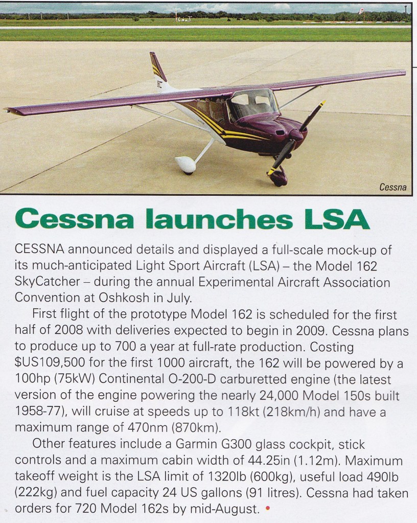 Cessna CE-162 Skycatcher Article 11/07/2025Terry Back to Cessna CE-162 Skycatcher October 2007 Share this: Click to share on X (Opens in new window) X Click to share on Facebook (Opens in new window) Facebook Like Loading... Related