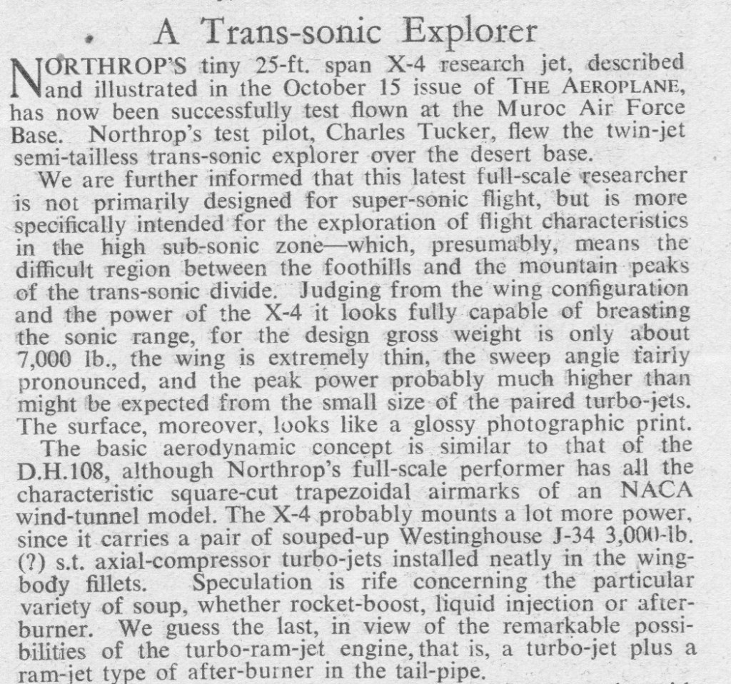 Northrop X-4 Article 15/08/2025Terry Back to Northrop X-4 X-4 twin-jet now under flight-test at MurocDecember 1948 Share this: Share on X (Opens in new window) X Share on Facebook (Opens in new window) Facebook Like Loading... Related