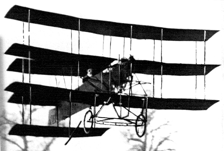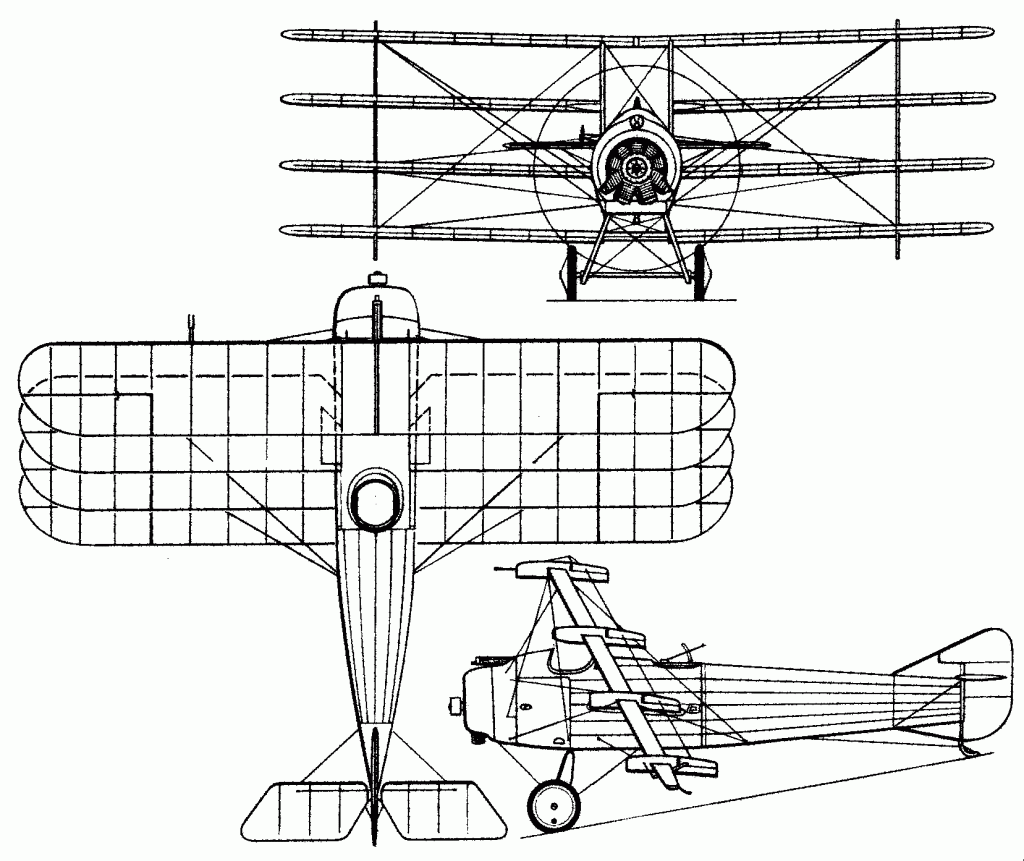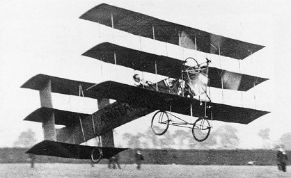 It was a single seat triplane powered by a 35 hp Green water-cooled, four cylinder engine. The engine’s radiators were mounted flush along the side of the front section of the triangular shaped fuselage, which was constructed from ash, with silver spruce struts and spars, all covered in Pegamoid fabric. The three wings were of equal length, as was the triplane tail section, from which control of climbing and diving by means of pivoting the entire section, which was in turn linked to the centre mainplane variable incidence gear, was carried out. Control of the mainplane was by a single cntrol stick in the pilot’s cockpit. The two wheeled undercarriage was secured to the axle by rubber shock absorber cord, which in turn was fixed to a rigid, tubular steel triangulated structure.