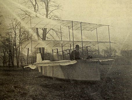 Melvin Vaniman built his own aeroplane in 1906… a triplane, in fact… the first ever triplane. Made of three arched planes, supported by a frame of steel tubes, each measuring 11 meters (36-feet) in length and 2 meters 20 cm (7.2-feet) in breadth. Total surface area: 72 (square) meters (775-square-feet). 70/80 HP Antoinette engine with 8 cylinders driving a propeller with two arms placed to the rear. The length is six meters (19.7 feet). In front, two elevators (or rudders): one horizontal and placed in the lower part, serves to control the altitude; the second, vertical, placed about 2/3 of the height of the machine, controls the direction and the turning, whether one tilts to the right or the left. The function of warping the wings is made by means of an arrangement placed on the shoulders of the aviator, and the direction to the right or the left by means of two pedals. Total weight: 500 kilograms (1,102.3-pounds).