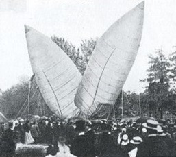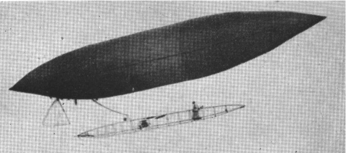 The first dirigible was 25 m (8½ ft) long and contained 180 cubic metres (6400 cubic feet) of hydrogen gas beneath which he suspended a 3½ hp petrol engine, called “Brazil”. On 18 September 1898 he took off from the jardin d’acclimatisation in the Bois de Boulogne and promptly ended up in a clump of trees. Know-all bystanders had advised him to take-off downwind. Two days later he was back, this time rising effortlessly into wind to complete a figure of eight 400 m (1300 ft) above an astonished, cheering crowd. ‘Le Petit Santos’ — for he weighed just 49 kg (108 lb) — was an instant hero.