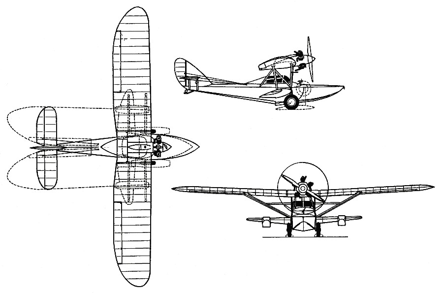 The wing box was located on the hull, fixed to its structure by means of triple 160 mm long supports made of welded steel tubes. In the intrados of the lower plane, the stabilization floats were located, made of wood with quite flat shapes. The control surfaces consisted of two fabric-covered wooden fins.