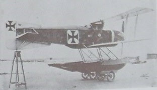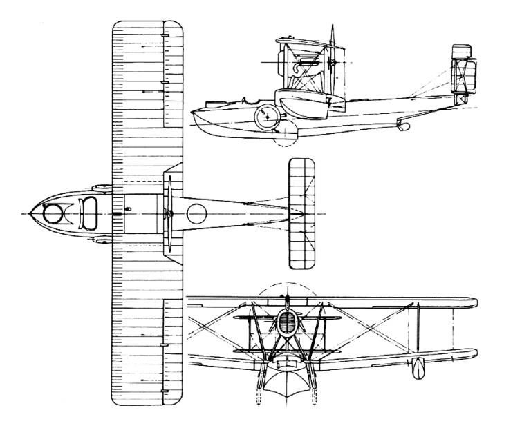 The wing bracing is only one pair of struts on each side. The upper plane is of slightly greater span than the bottom, and the inter-plane struts slope outwards. The lift and landing loads are taken by tubes sloping from the floats outward to the lower surface of the bottom plane at the points where occur the inter-plane struts. A speed of 155 km. per hour is estimated.
