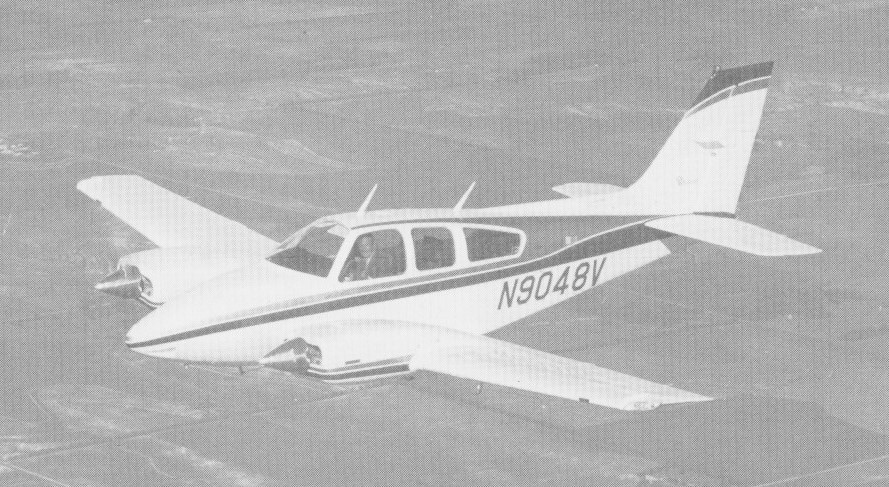 D50A-E Engines two 295-hp Lycomings Seats 6. Gross Wt. 6300 lbs. Empty Wt. 3981 lbs. Fuel capacity 180 USG. Top speed 214 mph. Cruise 203 mph. Stall 71 mph. Initial climb rate 1450 fpm. Ceiling 20,000 ft. Range 1650 sm. Takeoff distance (50’) 1260 ft. Landing distance (50’) 1452 ft.
