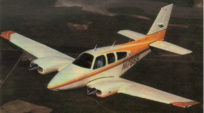 BE-E55 Baron First built: 1966. Engine: 2 x Continental IO-520-CB, 285 hp. TBO: 1700 hrs. Prop: Hartzell 2 blade, constant speed 78 in. Seats: 4/6. Length: 29 ft. Height: 9.2 ft. Wingspan: 37.8 ft. Wing area: 199 sq.ft. Wing aspect ratio: 7.2. Max ramp wt: 5324 lbs. Max take off wt: 5300 lbs. Standard empty wt: 3291 lbs. Max useful load: 2033 lbs. Max landing wt: 5300 lbs. Wing loading: 26.6 lbs/sq.ft. Power loading: 9.3 lbs/hp. Max useable fuel: 996 lbs. Climb rate: 1682 fpm @ 101 kts. Climb gradient: 999 ft/nm. Rate of climb @ 8000 ft: 1000 fpm. Service ceiling; 19,100 ft. SE rate of climb: 388 fpm @ 100 kts. SE climb gradient: 233 f/nm. SE ceiling: 6600 ft. Max speed: 208 kts. Cruise @ 65% power @ 8,000ft: 190 kts. Fuel flow @ 65% power @ 8,000ft: 161 pph. Endurance @ 65% power @ 8,000ft: 6 hr. Stalling speed clean: 83 kts. Stall speed gear/flaps down: 73 kts. Turbulent air penetration speed: 156 kts. Retractable undercarriage.