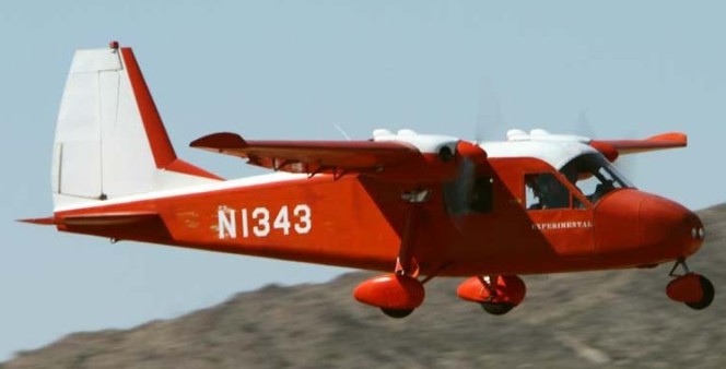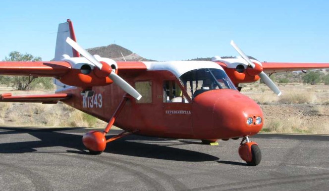 The model B is a high-wing, fixed tricycle landing gear, all metal, twin engine aircraft. The aircraft uses all aluminum construction with fiberglass cowlings, nose cone and wheel pants. The wings are configured with Fowler flaps. The two 25 U.S. gallons (95 L; 21 imp gal) fuel tanks are independent of each other. There is no cross-feed. The aircraft uses a throw-over yoke control, similar to a Beechcraft Bonanza.