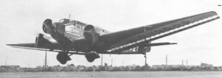Junkers Ju 52/3M Tante Ju Engines: 3 x BMW 132 A/3, 819 hp Length: 62.008 ft / 18.9 m Height: 20.013 ft / 6.1 m Wingspan: 95.965 ft / 29.25 m Wing area: 1189.422 sq.ft / 110.5 sq.m Max take off weight: 23152.5 lb / 10500.0 kg Weight empty: 14531.0 lb / 6590.0 kg Max. weight carried: 8621.6 lb / 3910.0 kg Max. speed: 143 kt / 264 km/h Initial climb rate: 787.4 ft/min / 4.0 m/s Service ceiling: 16732 ft / 5100 m Wing loading: 19.48 lb/sq.ft / 95.0 kg/sq.m Range: 648 nm / 1200 km Endurance: 7 h Crew: 3 Payload: 17 Pax