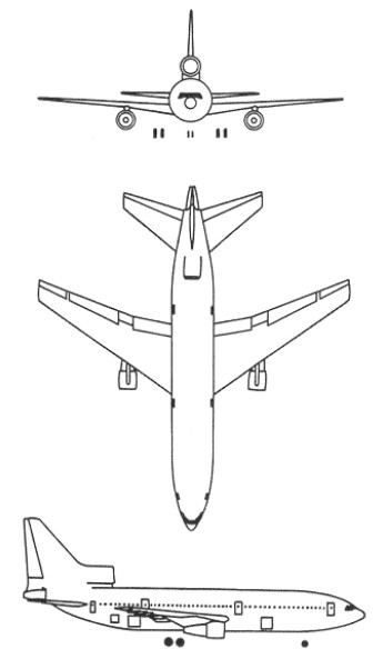 L-1011 Tristar Engines: 3 x Rolls Royce RB.211 22B turbofan, 42,000 lb / 180.5kN Wing span: 155 ft 4 in (47.34 m). Length: 178 ft 8 in (54.35 m). Height: 55 ft 4 in (16.87 m). Wing area: 312.1 sq.m / 3359.41 sq ft Empty wt. 102000 kg / 222,941 lb Max TO wt: 430,000 lb (195,045 kg). Fuel capacity 23,814 USG Max level speed: M0.9. Cruise 474 mph. Stall 144 mph. Initial climb rate 2,800 fpm Ceiling: 42,000 ft. Range w/max.payload: 5000 km / 3107 miles Pax cap: 345. Takeoff run 7,590 ft Landing roll 5,660 ft Crew: 2-3