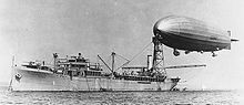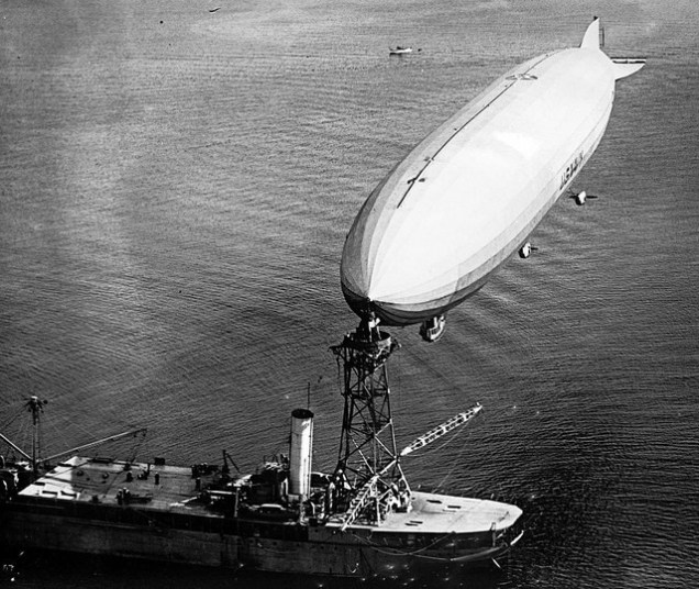 In July 1924, the oiler Patoka put in at Norfolk Naval Shipyard for extensive modifications to become the Navy’s first airship tender. An experimental mooring mast 125 ft (38 m) above the water was constructed; additional accommodations both for the crew of Shenandoah and for the men who would handle and supply the airship were added; facilities for the helium, gasoline, and other supplies necessary for Shenandoah were built, as well as handling and stowage facilities for three seaplanes. Lansdowne conducted pioneering operations in which he moored Shenandoah to a mast installed on the support ship Patoka, to show the possibility of underway replenishment and supply to extend the ship’s range and allow an airship to work closely with the fleet, and Lansdowne conducted operations with surface ships such as the battleship USS Texas whenever possible. The first successful mooring was made on 8 August. During October 1924, Shenandoah flew from Lakehurst to California and on to Washington State to test newly erected mooring masts. This was the first flight of a rigid airship across North America.