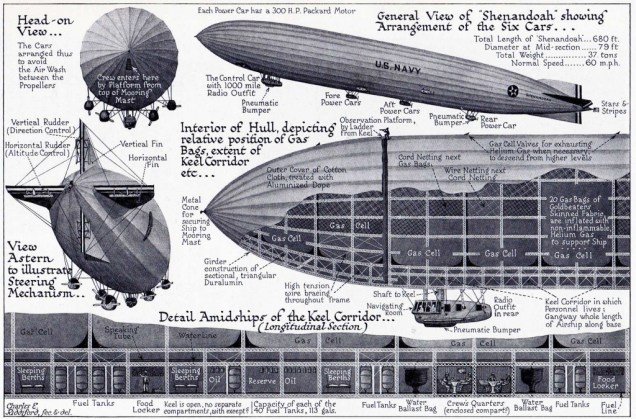 As the first rigid airship to use helium rather than hydrogen, Shenandoah had a significant edge in safety over previous airships. Helium was relatively scarce at the time, and the Shenandoah used much of the world’s reserves just to fill its 2,100,000 cubic feet (59,000 cu.m) volume. Los Angeles—the next rigid airship to enter Navy service, originally built by Luftschiffbau Zeppelin in Germany as LZ 126—was at first filled with the helium from Shenandoah until more could be procured.